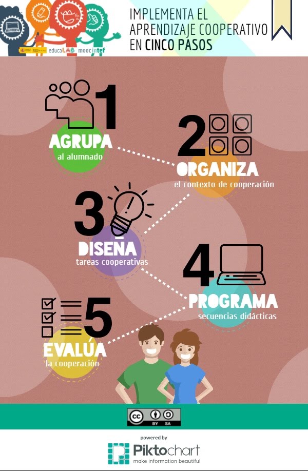 En la siguiente infografía de EducaLAB nos dan cinco pasos para poder introducir el aprendizaje cooperativo en el aula y conseguir buenos resultados.